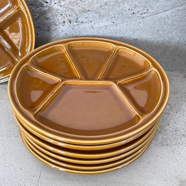 Oker is een warme, diepe geel/bruin tint, typisch voor de seventies retrolook. Veel gebruikt in keramiek en servies uit die tijd. Combineert mooi met aardetinten, bruin, oranje, en olijfgroen – allemaal typische kleuren van die periode.
