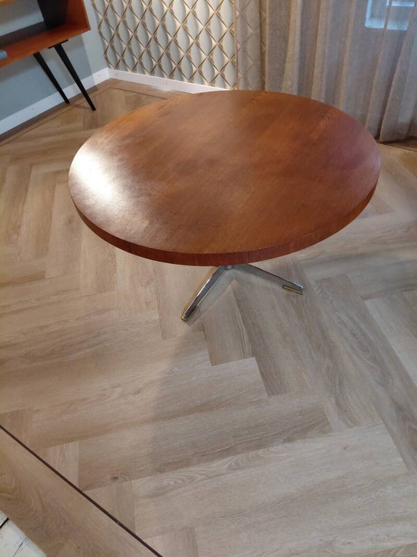 Grote ronde salontafel jr. 60 Houten blad met rvs vierpoot.105 cm doorsnee x 43 cm hg
