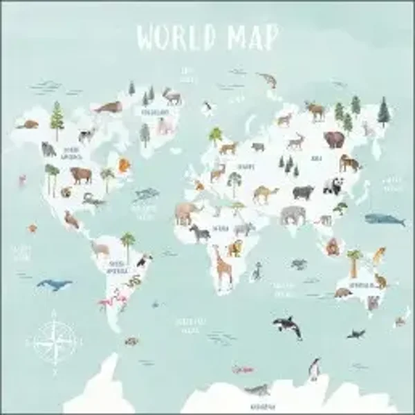 Een wereldkaart als behang, waarmee je vanuit vogelperspectief alle diersoorten ter wereld kunt zien. Dit panoramische behang is zowel mooi als zeer functioneel. Het staat prachtig aan de muur van je kantoor, slaapkamer of zelfs in het klaslokaal.
